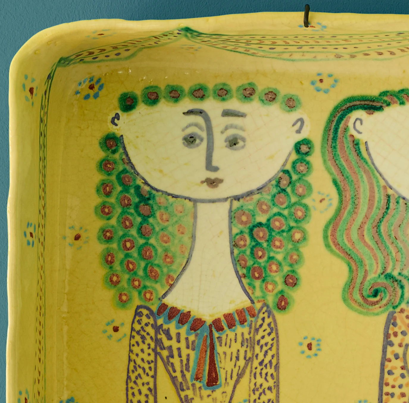 A rare square ceramic platter by Birger Kaipiainen, featuring an enchanting scene of stylized figures in a garden.
