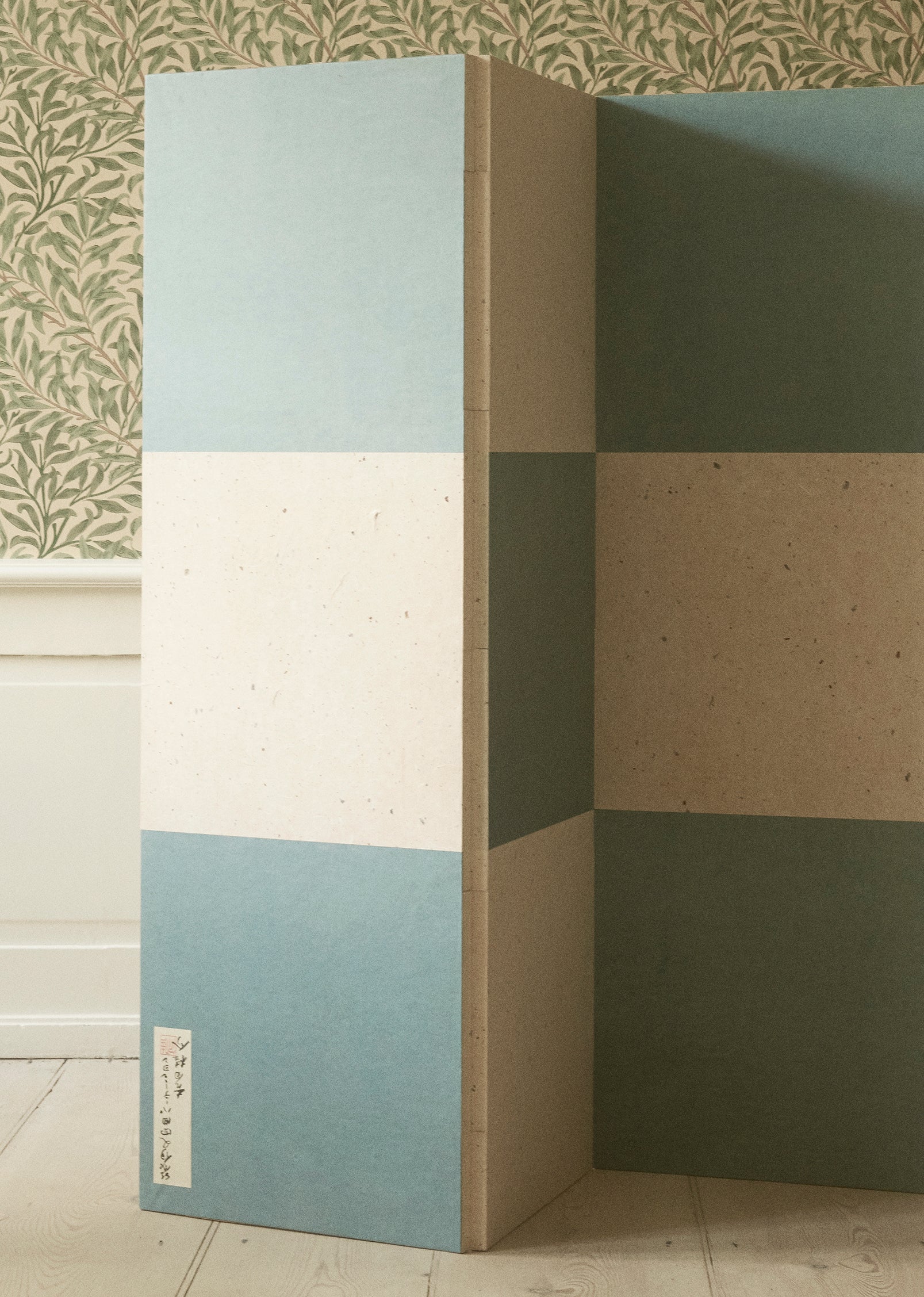 A striking three-panel folding screen or 'Paravent' designed by Keisuke Yoshida, featuring a bold checkered pattern.