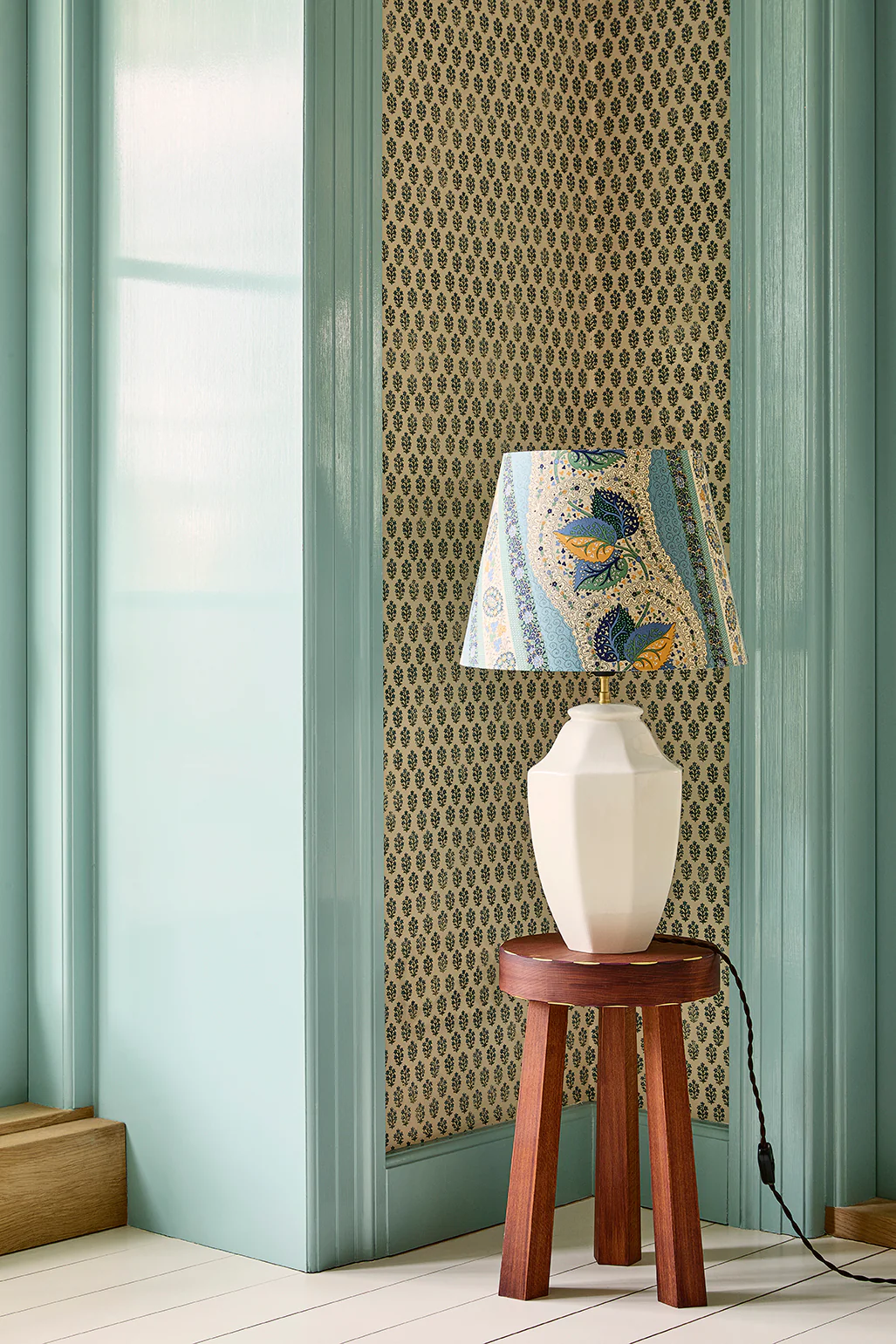 An elegant table lamp featuring a sculptural white ceramic base paired with a vibrant, patterned silk shade.