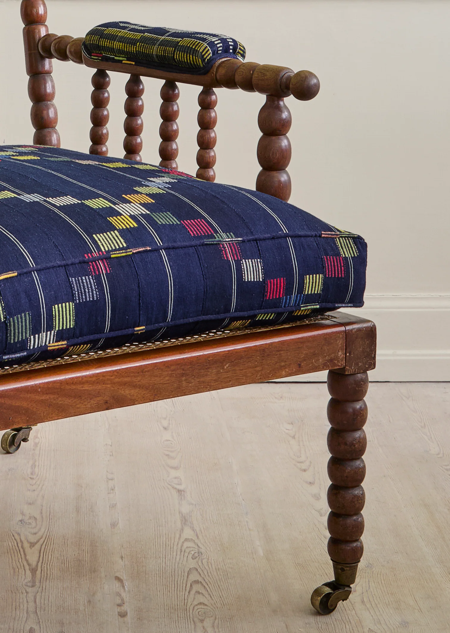 A stunning Bobbin-style armchair featuring traditional spindle-turned legs and armrests in a rich, dark-stained oak.
